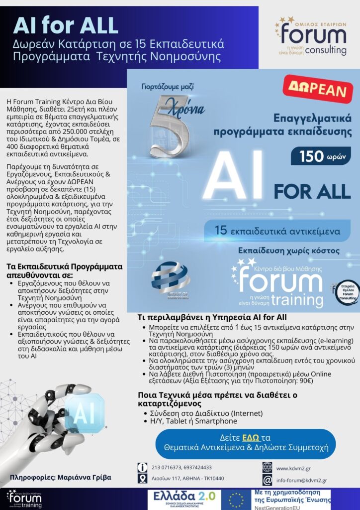 Η νέα ψηφιακή εποχή φέρνει μαζί της τεράστιες ευκαιρίες για τις μικρομεσαίες επιχειρήσεις , και η Τεχνητή Νοημοσύνη (AI) είναι το εργαλείο-κλειδί. Αυτό το πρόγραμμα προσφέρει μια πρακτική εισαγωγή στον κόσμο του AI, με έμφαση σε τεχνικές, εργαλεία και εφαρμογές που ενισχύουν την ανταγωνιστικότητα των ΜμΕ.