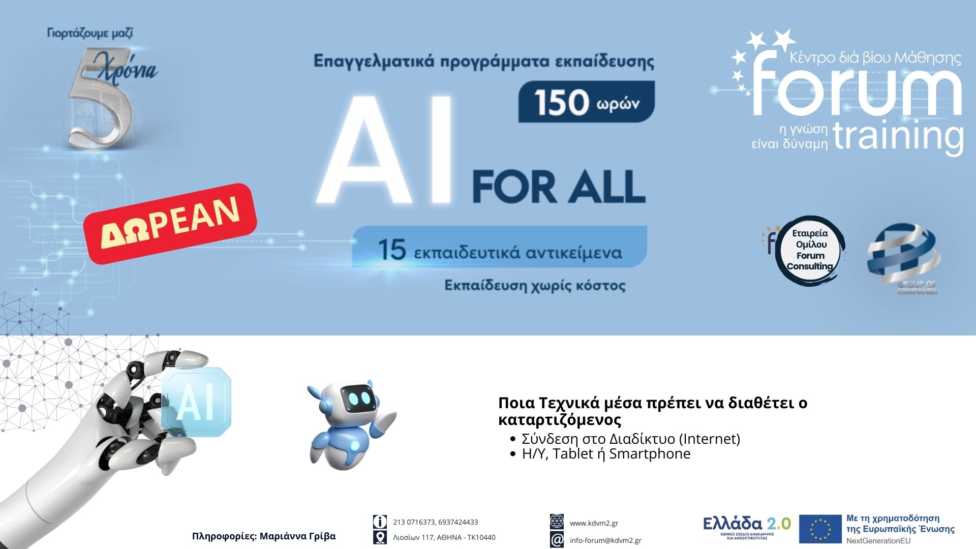 Αν θέλεις να γνωρίσεις σφαιρικά την Τεχνητή Νοημοσύνη — από τις βασικές έννοιες και τους αλγόριθμους έως τις σύγχρονες εφαρμογές της σε επιχειρήσεις, βιομηχανία και καθημερινότητα — τότε αυτό το μάθημα είναι η ιδανική αφετηρία.